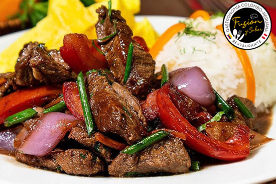 Lomo fino de res flameado y salteado al wok en salsa especial e ingredientes peruanos acompañado de arroz y papas casco.